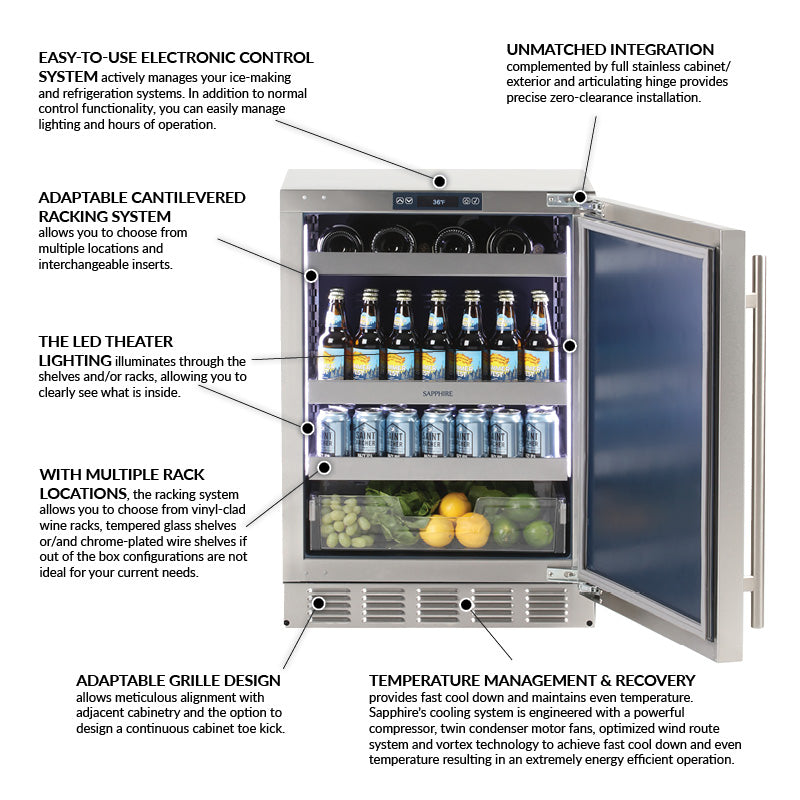 Sapphire models have been precisely engineered both inside and out. With the ability to manage a variety of wine bottles, beverage cans, and other storage needs, to unmatched precise integration into any 24” cabinet setting, Sapphire provides the right fit for your lifestyle.